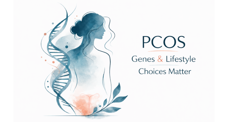 What Is PCOS? Polycystic Ovarian Syndrome (PCOS) is a complex hormonal and metabolic disorder affecting women of reproductive age. It is characterised by irregular menstrual cycles, hyperandrogenism (elevated male hormones) and polycystic ovarian morphology. Approximately 1 in 10 women of reproductive age worldwide lives with this condition, making it one of the most common disorders affecting reproductive and overall health (WHO,2023). What Happens In PCOS? In PCOS, the body’s hormones are out of balance, especially around the ovaries, insulin, and male-type hormones called androgens. The ovaries develop numerous small immature follicles, which create the polycystic appearance on imaging. More than 50% of women with PCOS have insulin resistance, meaning their cells don’t respond well to insulin (Naeem et al., Journal of Ovarian Research, 2025). As a result, the body produces more insulin, which can increase blood sugar levels, contribute to weight gain, and stimulate the ovaries to produce excess androgens, which worsens PCOS symptoms. Over time, this mix of hormonal and metabolic changes can affect fertility, skin, hair, mood, and long-term risk for insulin resistance, type 2 diabetes and cardiovascular disease. The Role of Genes PCOS is regarded as highly heritable, with research suggesting that roughly 60–70% of the variation in who develops the condition stems from genetic factors, influenced by a continuous interplay between our genes and everyday lifestyle habits (Mykhalchenko et al., Expert Review of Molecular Diagnostics, 2017). It is polygenic, meaning many genes contribute small amounts to overall risk. One of the most well-studied genes linked to PCOS is DENND1A (McAllister et al., Proceedings of the National Academy of Sciences, 2014). Like many genes, DENND1A exists in slightly different versions, known as genetic variations. These variations are small changes in the DNA code that make each person genetically unique. Research from populations around the world has found that certain versions or variations of the DENND1A gene are more common in women with PCOS, increasing their likelihood of developing the condition. These variations likely alter signal processing in ovarian cells, promoting excess androgen production that manifests as the listed symptoms. However, genes are not fixed on–off switches; lifestyle factors such as diet, physical activity, sleep, and stress can influence how strongly these genes are expressed, a process known as epigenetics. PCOS Is Manageable The encouraging part is that, while there is no cure for PCOS, many women can significantly improve their symptoms through consistent lifestyle changes. When these changes are aligned with an individual’s genetic makeup, they may have an even greater impact. Eating low-glycemic, balanced meals such as those recommended in the DASH diet, which emphasises vegetables, whole grains, nuts, and lean protein, helps keep blood sugar and insulin levels stable, supporting both metabolic and hormonal health. Regular exercise is equally crucial; even a 5% decrease in body weight can have a positive effect on hormone levels and ovulation (Silvestris et al., Reproductive Biology and Endocrinology, 2018). Additionally, a weekly goal of at least 150 minutes of moderate exercise, combined with strength training, may help increase insulin sensitivity. Changes in lifestyle, such as practising yoga or mindfulness to manage stress and prioritising sleep, are also important because long-term stress and insufficient sleep can increase cortisol levels, which in turn exacerbate inflammation and insulin resistance. Conclusion Although PCOS is a chronic condition, it can be managed effectively. Understanding your genetic predisposition gives you the power to make lifestyle choices that can epigenetically influence how these genes are expressed. Even small, consistent lifestyle steps can have a significant impact on managing PCOS, allowing women to take active control of their long-term health.